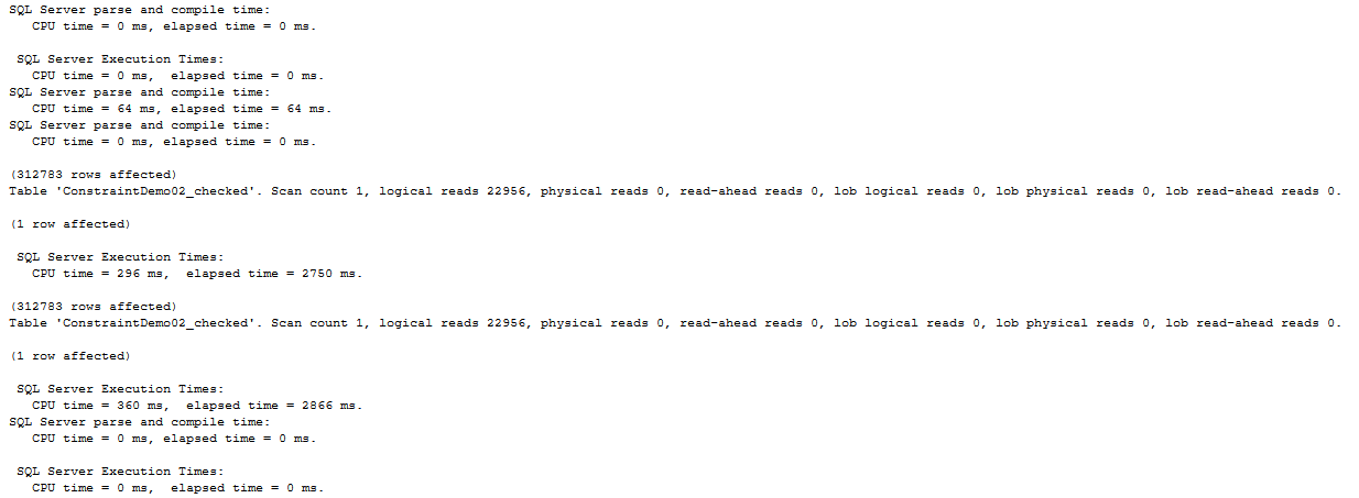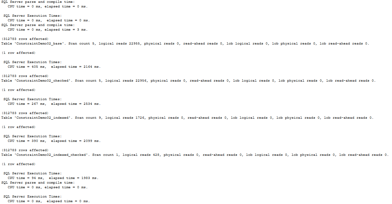 Os reads passam de quase 23k quando não temos índice para quase 2k quando temos índice. Já a check constraint faz maravilhas e fazemos menos de 500.