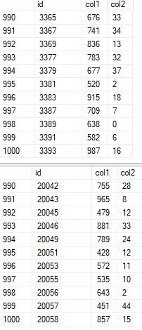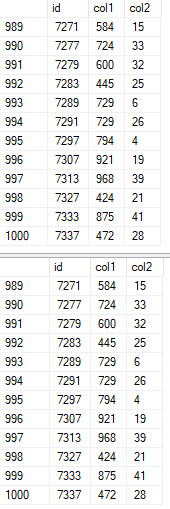 Até podemos ver onde a query com NOLOCK salta do id 385 para o 185593, enquanto sem NOLOCK segue a sequência que, para nós, nos parece a “lógica”.